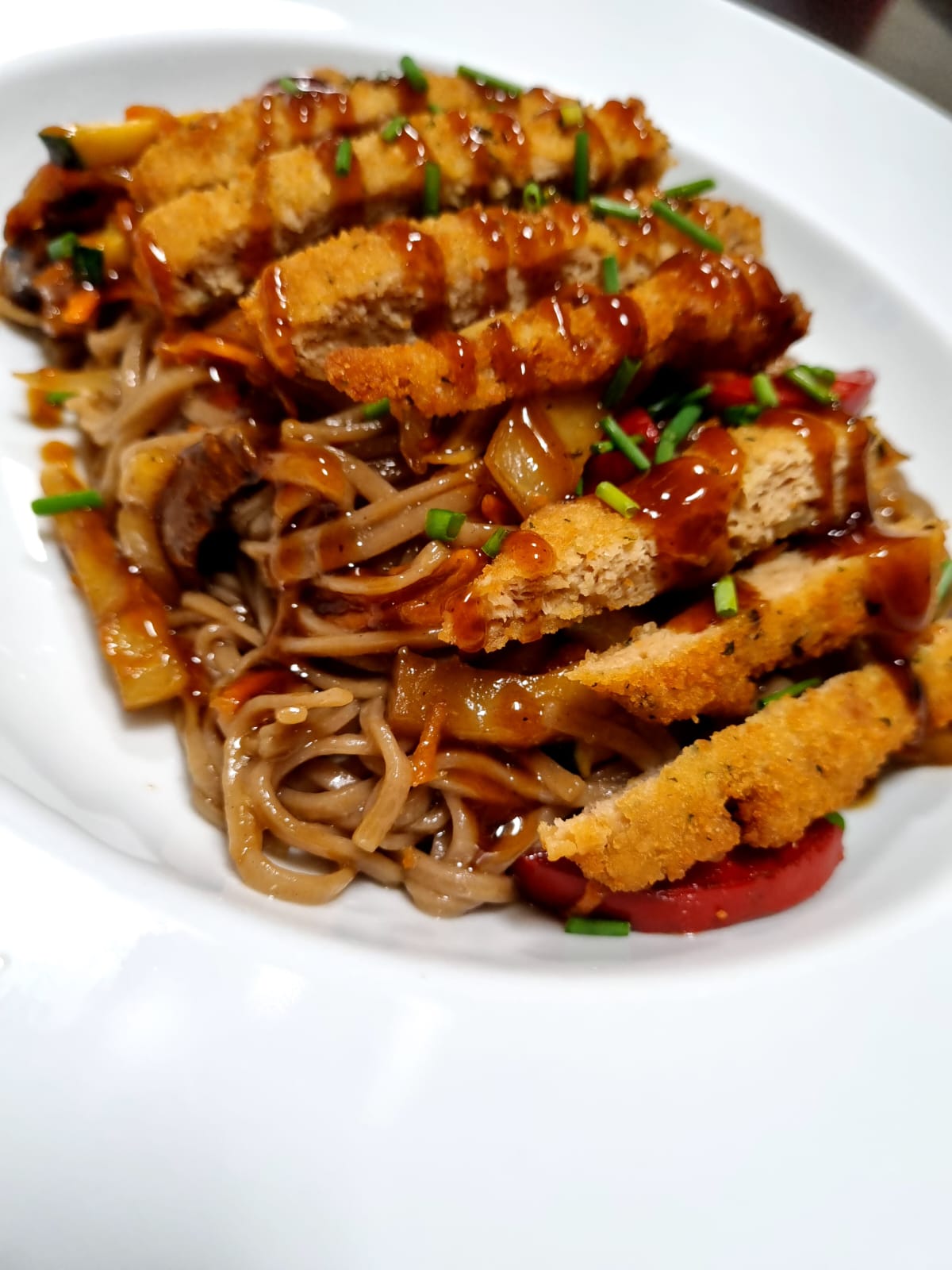 De trigo con verduras salteadas, escalope de soja trinchado y salsa teriyaki.
